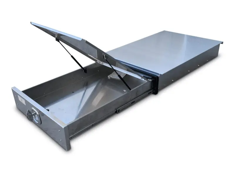 Like all Dunn & Watson under tray drawers, it features a lift-up lid that functions as a durable tabletop—providing a stable work surface for cooking or job-related tasks on the go. For those in need of a reliable 4×4 under tray storage solution, this drawer delivers performance, practicality, and long-lasting protection in one neat package.